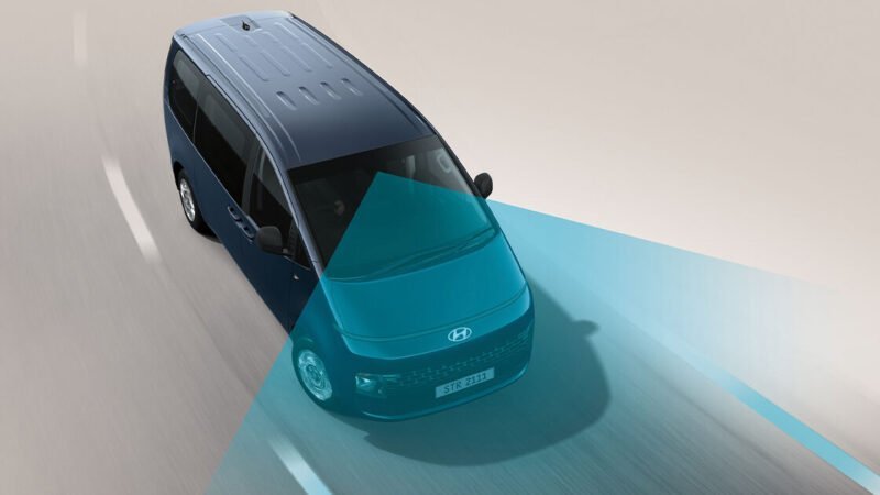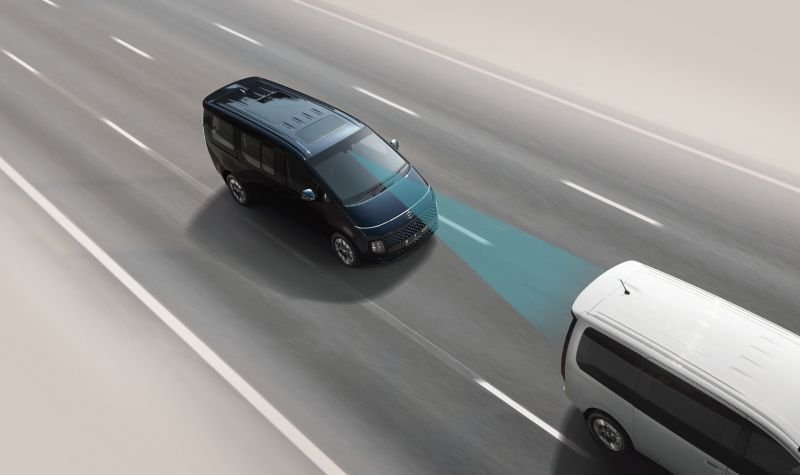 Kamera depan melacak penanda garis jalur dan membantu menjaga kendaraan tetap aman di tengah jalur.